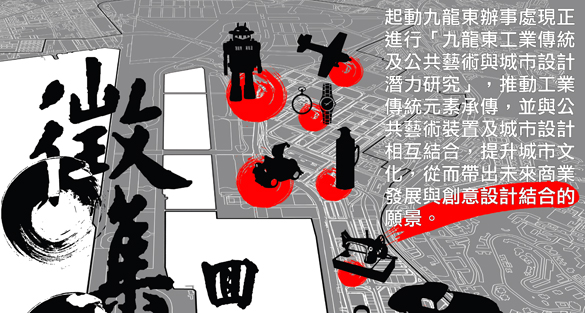 內容:起動九龍東辦事處於2012年底開展「九龍東工業傳統及公共藝術與城市設計潛力研究」,為觀塘及九龍灣的工業傳統進行系統性研究,推動工業傳統承傳,並與公共藝術裝置及城市設計相互結合,提升當區的城市文化,帶出未來與創意設計結合的願景。