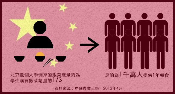 · 北京數個大學倒掉的飯菜總量約為學生購買飯菜總量的1/3。如果按照全國大專以上在校生總數量2,860萬人(2009年底數據)計,每年大學生們倒掉了可養活大約1,000萬人一年的食物