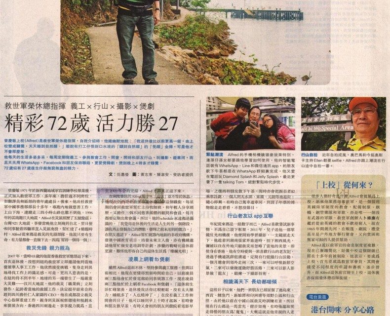 年紀從來都是一組數字而已。Alfred 喜歡嘗試新事物,不為自己設下框架。2011 年,兒子送他一部單鏡反光相機後,他便開始學習攝影,一支鏡頭走天下,他趁着到湖南張家界旅遊時,拍下湘西風光,彌補以往在外地只顧救災而忽略了當地的美景。即使身在香港,他有空時愛與一班喜歡行山的老友記,透過手機通訊群組溝通,定期自行組織行山活動,一個月總會到郊外走兩三次,一來可以呼吸新鮮空氣,二來可以做做運動舒筋活絡,三來可以影人影景做「龍友」,鍛煉一下攝影技術。