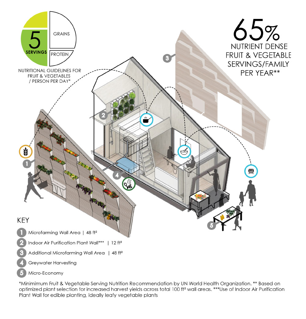 這款又稱「綠色小屋」的住宅模型由美國耶魯大學和建築事務所 Gray Organschi Architecture 合作,前後共花4星期完成設計及建造,初步目標是在各層面達到能源、用水及蔬食的自給自足用途。全屋室內空間約 20 平方呎,另設約 1.5 平方呎空間為隱藏機動櫥櫃。這棟小屋另有追蹤太陽能板、雨水收集、灰水回收器(即除廁所排放的廢水和糞尿外,來自家用浴缸、淋浴、洗手池和廚房洗滌槽等生活污水)、可種植的栽牆、錯層壓木材(CLT)結構等技術,以降低該建築所消耗之能源及資源。