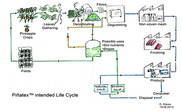 菠蘿葉纖維是種植收割的副產品,故此在製作Piñatex™時並不需要額外的肥料和水。由於菠蘿葉只含有5%纖維,Hijosa正與菲律賓的農產公司合作,把其餘的物料製成生物燃料。Hijosa亦希望在更多國家推廣可持續性的農業發展,在巴塞隆納已有合作夥伴,期望在菲律賓紡織研究中心的幫助下以 Piñatex™製作成品。