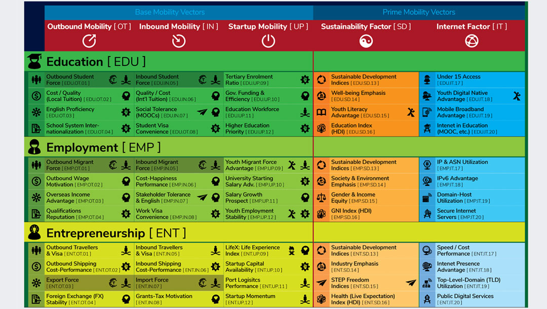 青年移動力指數(YMI.Asia)主要依據 三大領域作歸納運算:教育移動力、事業移動力及初創移動力;再配合五大移動力量向,包括出走動力(Outbound Mobility);內訪動力(Inbound Mobility)、起動動力(Start-up Mobility)、可持續發展因素及互聯網因素。通過收集來自亞洲20 個地區各樣研究數據,2018年比較歸納合共 15 個組成部分,得出共 60 個指標組合。