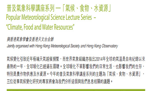 如今溫室效應已越趨嚴重,香港科學館則與香港氣象學會及香港天文台合辦講座,邀請了三位從事氣候變化研究的專家,就「氣候、食物、水資源」這個議題與我們深入探討氣候變化爲我們帶來了什麽改變,又會如何影響我們的生存,特別是農作物供應及水資源方面的轉變。
