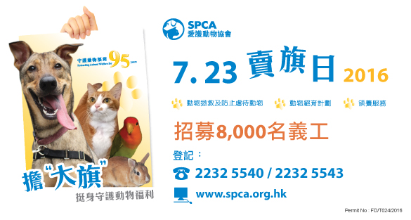 詳情:愛護動物協會全港賣旗日將於7月23日(星期六)舉行,今年嘅動物旗子大左又靚左,好吸引架!請立即 登記成為賣旗義工,一齊擔「大旗」,挺身而出守護動物福利!