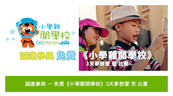 <<小學雞開學校>> 3天夢想營由DotAsia Foundation 及 DreamStarter 主辦,希望透過活動,鼓勵小學生運用創意,把夢想和學習連缐,構思一間夢想校園,為未來學習帶來改變的計劃。 活動將以小組形式進行,由1至2位導師帶領約5-8位小學生 (一至六年級),於3日的夢想營構思一個「夢想校園」的藍圖。是次活動預計有80名小學生參加,勝出隊伍將獲得做一天校長的機會,更有機會向政府官員丶教育界人士以及巿民大眾介紹他們的計劃和理念。