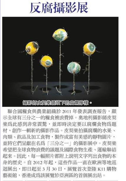 聯合國糧食與農業組織於2011年發表調查報告,顯示全球有三分之一的糧食被浪費掉。奧地利攝影師皮契樂為此感到非常震驚,並即時決定要以腐爛食物為題材,創作一輯新的攝影作品。皮契樂拍攝腐爛的水果、肉類、飲品及加工食物,製作成富有美感的靜物圖片,並將它們呈獻在名為「三分之一」的攝影展中。皮契樂希望把全球食物浪費的議題及國際食物生產、運輸聯結起來。因此,每一幅照片都附上說明文字列出食物的本身的歷史。自2012年起,這些作品一直在歐洲等地巡迴展出,即日起至3月30日,展覽首次登陸K11購物藝術館,香港成為該展覽於亞洲區的首個展出站。
