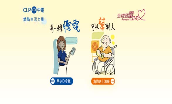 今年,中電再接再厲舉辦 「全城過電」計劃 ,結合推廣節能及關愛社區兩大元素。參加者於6月15日至8月14日期間積極慳電,既可節省電費,更可以幫人!中電會將所有參加者所慳得的電費,以股東的資金捐贈予有需要人士,協助他們減輕電費開支。