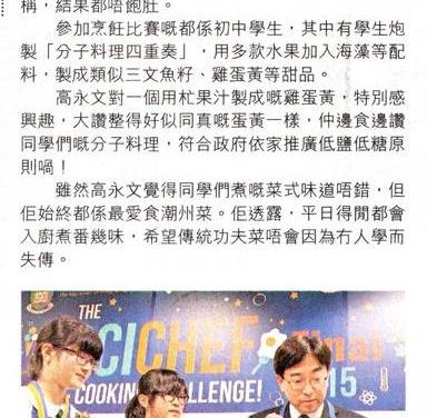 Read MoreChinese Only 香港大學理學院、教育局及非政府組織Go.Asia 前日聯合舉行首屆「科學廚神挑戰賽」,12...