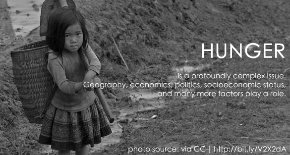 Hunger is a profoundly complex issue. Geography, economics, politics, socioeconomic status, and many more factors play a role. Poverty is often an underlying cause, along with natural disasters, conflict, poor agricultural infrastructure, or lack of access to the marketplace. Recent economic crises and volatile food prices also place people at an increased risk of hunger.