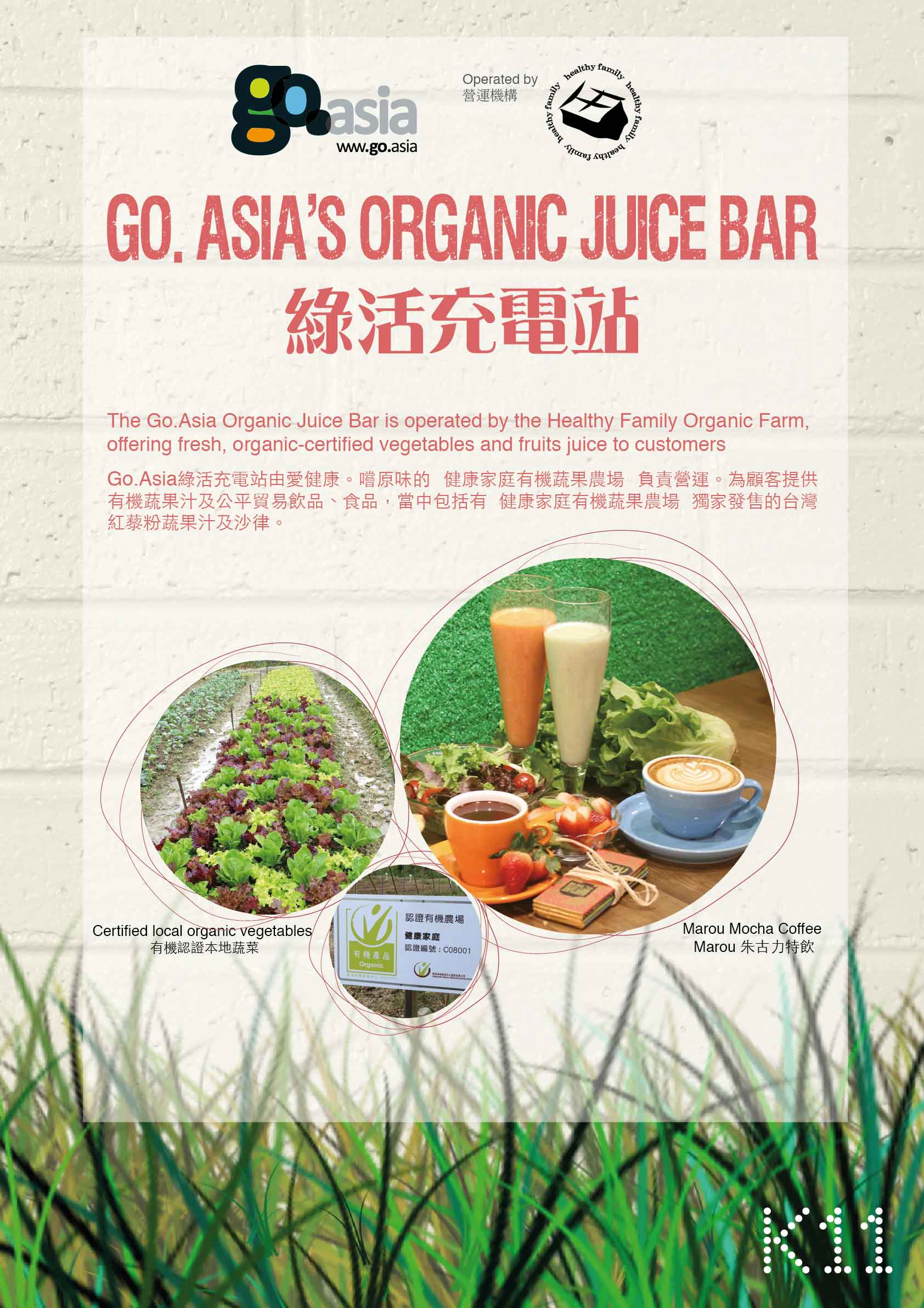 The Go.Asia’s Organic Juice Bar is operated by the Healthy Family Organic Farm. The farm, originally located in Fanling, will be offering fresh, organic-certified vegetables and fruits juice to customers.