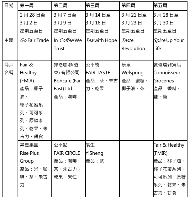 參與是次小墟的本地公平貿易商戶包括:邦恩咖啡(遠東) 有限公司、 公平點、公平棧、康泉、昇嘉集團、易生、喜筷食品(饗璫璫雜貨店)以及Fair & Healthy (FMIR)。