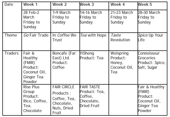 Participating Trader Partners: Boncafe (Far East) Ltd., FAIR CIRCLE, FAIR TASTE, Welspring, Rise Plus Group, YiSheng, Chopsticks (aka Heng Dong Dong Connoisseur Groceries), Fair & Healthy (FMIR).