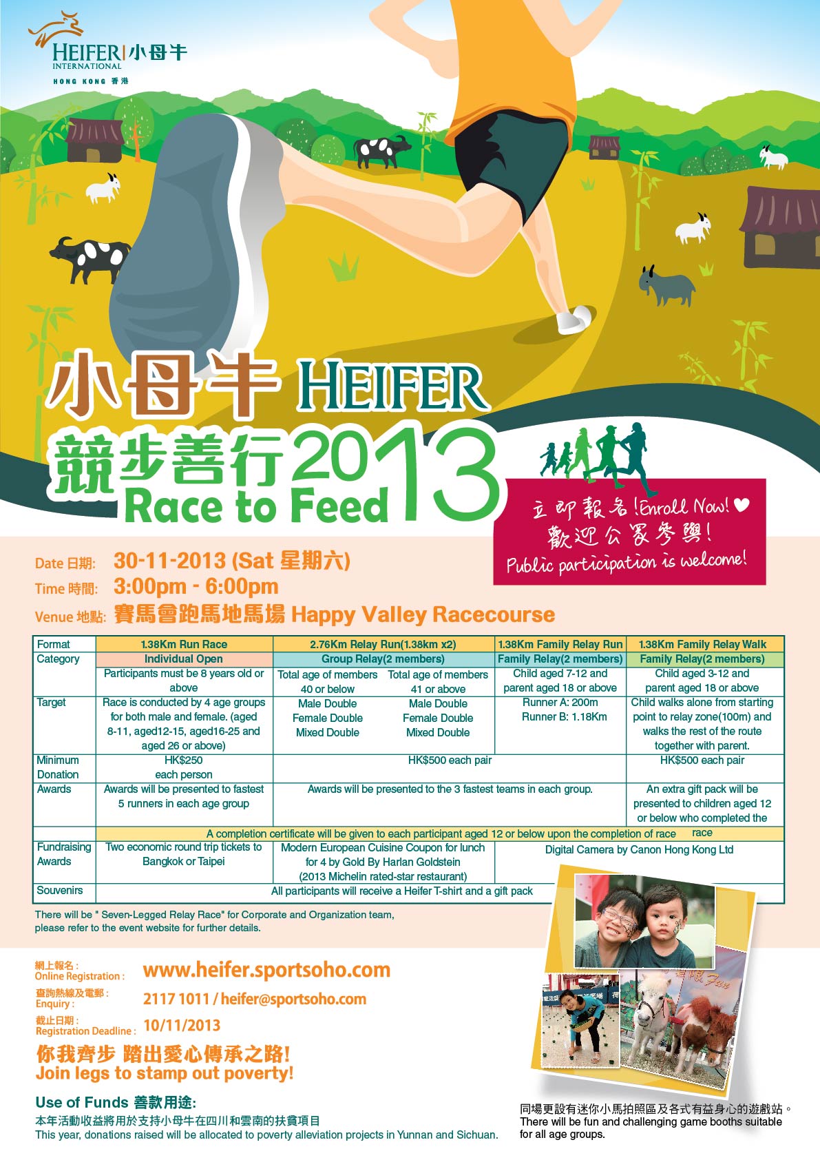 Detail: Heifer Hong Kong’s annual fundraising event “ Race to Feed” will be held on November 30 this year. Two new categories are incorporated in this year’s event – individual open race and family/group team charity walk. Both kids and adults are welcome to join! Proceeds of this event will be used to support Heifer’s poverty alleviation projects in Yunnan and Sichuan. (Click here for event poster.)