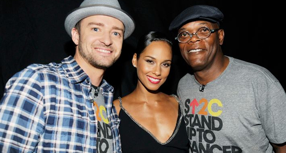 [Here’s a shot of Justin, Alicia Keys and Samuel L Jackson at Stand Up To Cancer Telethon at The Shrine Auditorium on September 7, 2012 in LA. (Photo: Kevin Mazur/American Broadcasting Companies Inc via WireImage).]