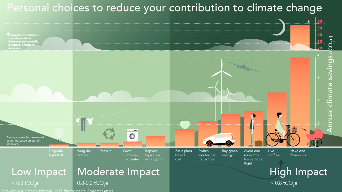 Here are some suggestions from Dr. Kimberly Nicholas, Associate Professor of Sustainability Science Lund University Centre for Sustainability Studies and Seth Wynes, PhD Student, University of British Columbia.