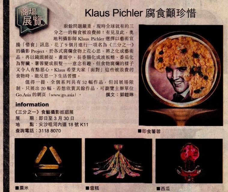 廚餘問題嚴重,現時全球就有約三分之一的糧食被浪費掉!有見及此,奧地利攝影師 Klaus Pichler 選擇以藝術宣揚「惜食」訊息,花了9個月進行一項名為《三分之一》的攝影Project,於各式腐爛食物上花心思,將之化成藝術品,再以鏡頭捕捉。畫面中,長香腸化成波板糖、番茄化為腎臟、薯蓉變成假髮……意念有趣,但食物腐爛的樣子又令人有點惡心。Klaus希望大家「面對」這些被浪費的食物時,能反思一下生活習慣。