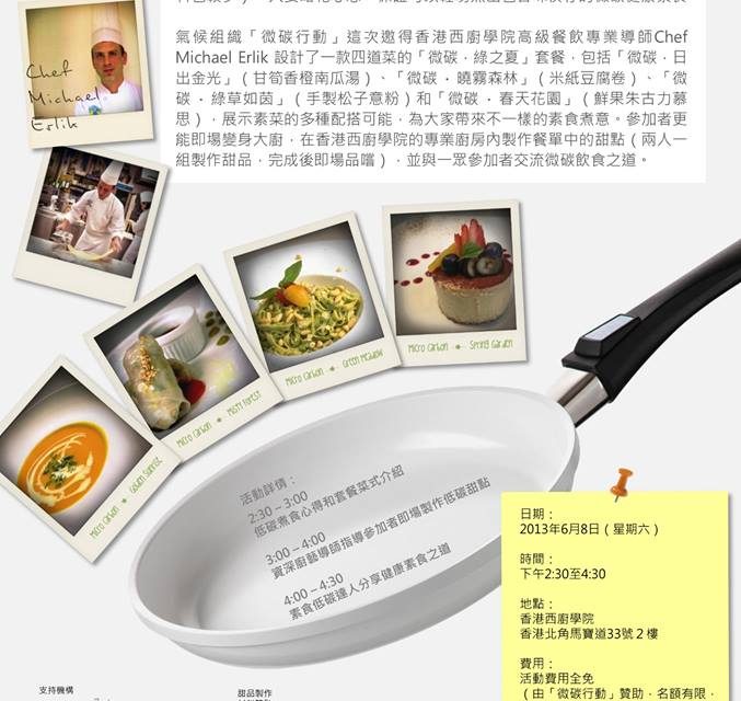 Details: In response to UNEP World Environment Day 2013, Micro Carbon Operation is going to host a free veggie cooking class for you! Go veggie is never boring! Chef Michael Erlik from Hong Kong Culinary Academy will show you how interesting and yummy that could be.