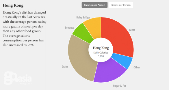Daily diets vary considerably around the world. National Geographic therefore built an interactive visual to show the domestic utilisation for food consumption in each country or region from 1961 to 2011. Click to check the diet with Hongkongers.