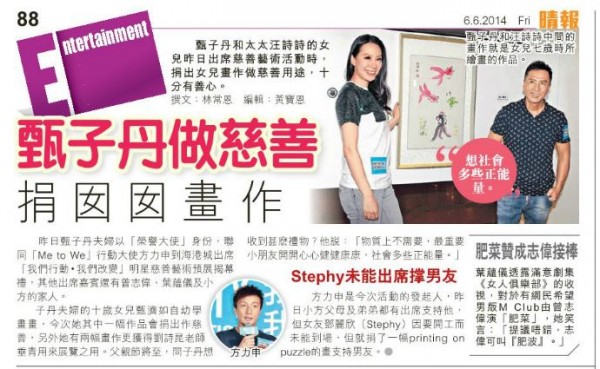 Go.Asia 發起人甄子丹和太太汪詩詩的女兒昨日出席慈善藝術活動時,捐出女兒畫作做慈善用途,十分有善心。 昨日甄子丹夫婦以「榮譽大使」身份,聯同「Me to...