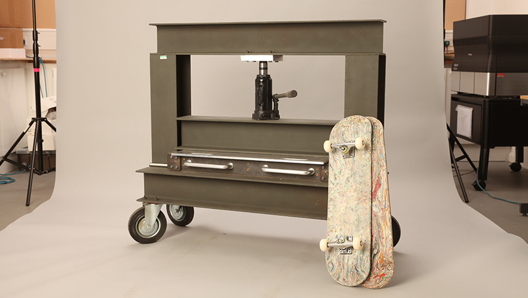 Basically the boards are made by putting the plastic in a machine which heats it to around 200 degrees Celsius (roughly 400 degrees Fahrenheit) for up to two hours, then uses pressure to mould it into a solid object. Around 1,500 plastic bags, or 1.8 kg are used to make a skateboard deck.