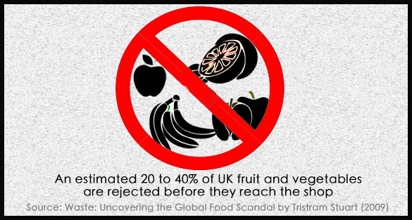 · An estimated 20 to 40% of UK fruit and vegetables are rejected before they reach the shops, mostly because they do not match the supermarkets’ strict cosmetic standards
