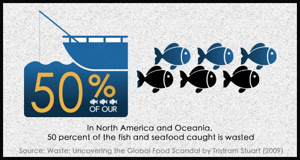 · In North America and Oceania, 50 percent of the fish and seafood caught is wasted